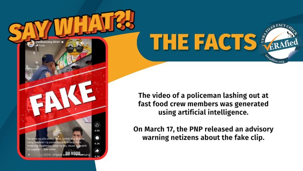 A video supposedly showing a policeman lashing out at crew members of a fast food restaurant is circulating online. The clip is fake and generated using artificial intelligence.