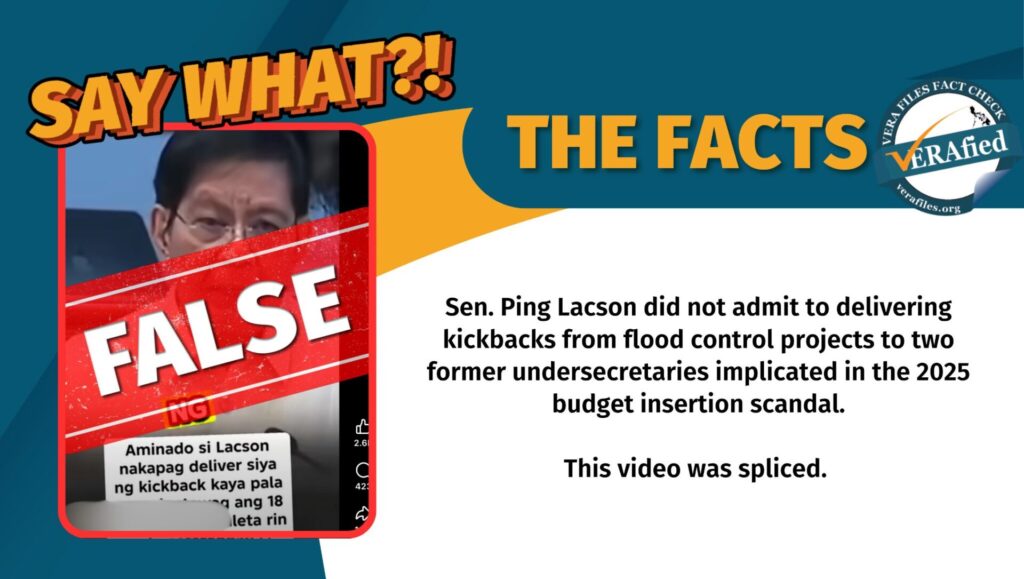 A video claiming Sen. Ping Lacson admitted he delivered kickbacks from flood control projects to former undersecretaries is spliced.