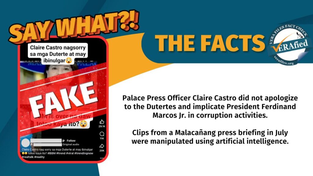 A video of Palace Press Officer Claire Castro supposedly apologizing to the Dutertes is circulating online. The video is manipulated using AI.