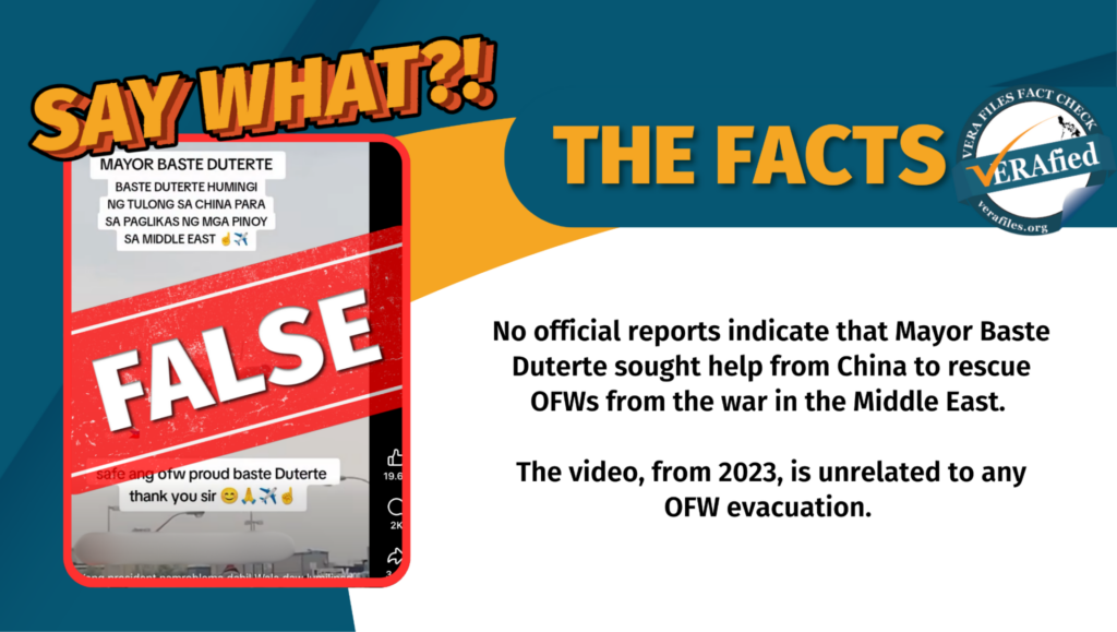 A video of the supposed arrival of an airplane in the Philippines, which is being linked to claims that Davao City Mayor Baste Duterte asked China to rescue OFWs from the Middle East, is circulating online. This is false.