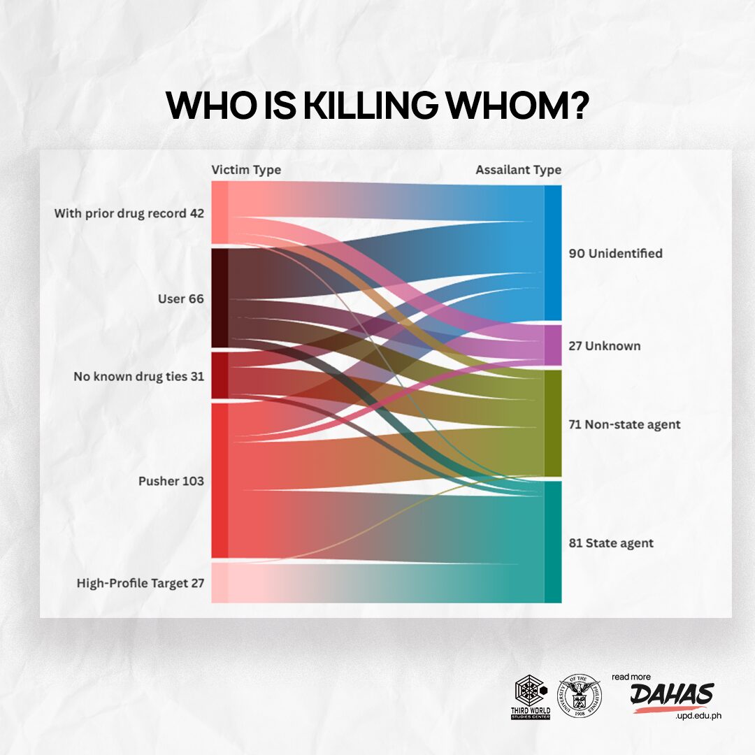 The Dahas Project refers to unidentified assailants as those seen by witnesses or captured in video recordings but with insufficient information to identify them by name and in person. Those who were positively identified as private individuals or members of insurgent groups are categorized as non-state agents. And the assailants that were not seen by any witnesses and usually those responsible for cases of body dumps are classified as unknown assailants.
