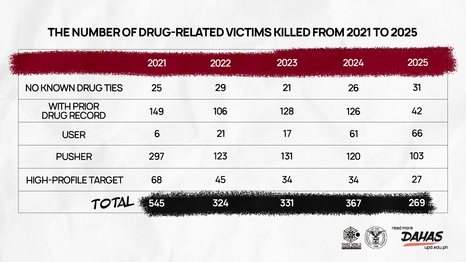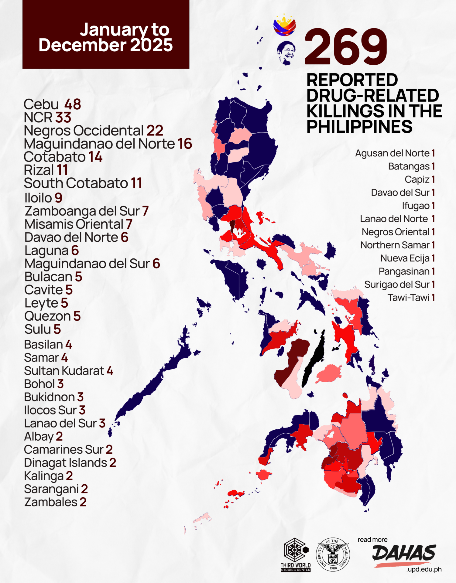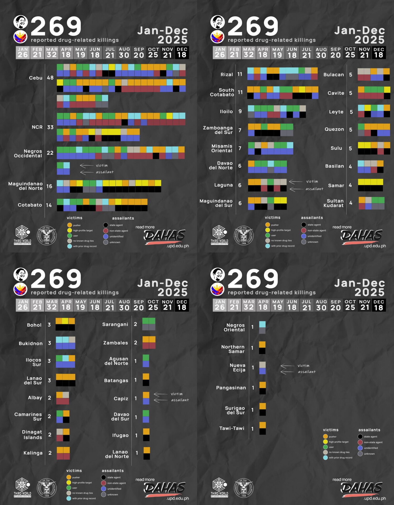 In 2025, the Dahas Project logged 269 reported drug-related killings, a 26.7 percent decrease from the 367 cases that it recorded in 2024—less deaths, yes, but again, not bloodless at all. This is the lowest recorded number of drug-related killings since 2021 when the Dahas Project started its weekly monitoring. Most of those killed in 2025 were identified in the news reports as pushers. State agents and unidentified assailants were the main perpetrators of the killings.