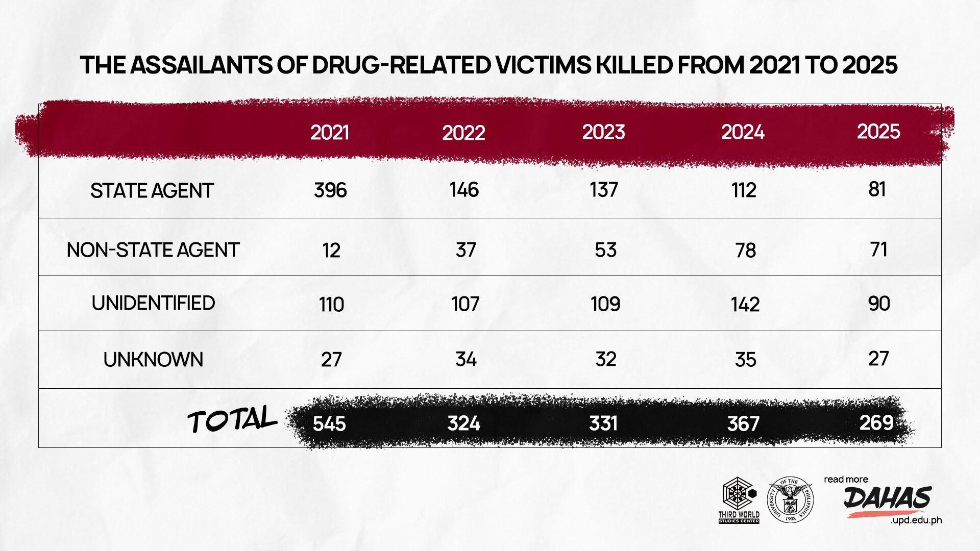 For the second consecutive year, unidentified assailants predominated with 90 killed or 33.5 percent of all the killings. State agents came second with 81 killed. While there is a decrease in the number of victims killed by the state, the proportion of victims killed by state agents to the total killed in 2025 remained close to that of 2024: from 30.8 percent to 30.1 percent. State agents have mainly killed pushers (45 of 81).