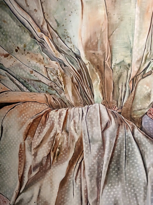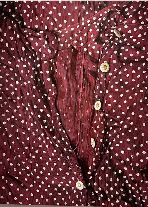The first part is a series of photorealistic paintings of the dresses based on details (“their patterns, textures, and minute details”) of old and worn-out children’s clothes made by her grandmother for Marina’s mother and her twin sister. It celebrates their fragility and all the stitches and mends through time.