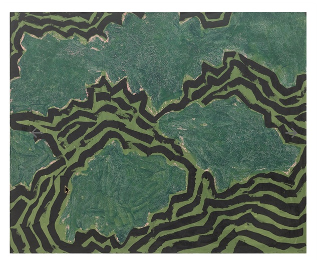 A veil floats in a murky sea of violet in A Veil Left by the Tides of Life, 2025; Veins of Bandages, 2025 traces of strips of gauze crisscrossing each other and overlaid with stripes of green and reddish purple.