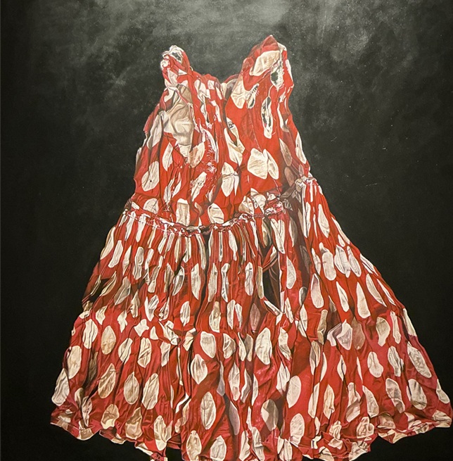 Meticulous renderings of clothes with all its crinkles, ruffles, trimmings, stains, and stitches reflect Marina’s total artistic control. The clothes with its holes and frayed edges have become witness to our own fragility and vulnerability, the inevitable ravage of nature against our mortal bodies.