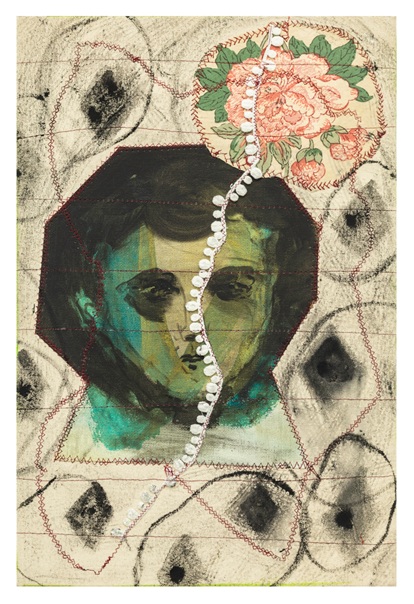 The third part is a series of fabric collages where the artist stitched scraps of garments onto canvas, and made “splotches, rough strokes, and organic patterns.” Hazy images of people emerge, like apparitions in fragmented dreams.