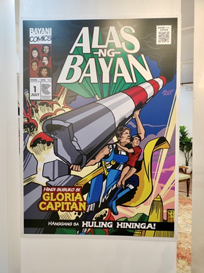 Constantino says he and Pangilinan kept the superheroines grounded, rooting their “superpowers” in traits they possessed. The first superheroine that museum-goers see is Gloria Capitan (28 March 1959 – 1 July 2016), who, according to the panel, was an anti-coal activist and human rights defender affiliated with the Coal-Free Bataan Movement, and a former president of the community-based organization Samahan ng Nagkakaisang Mamamayan ng Lucanin. The organization campaigned against the construction of a coal plant and open coal storage facility in Barangay Lucanin in Mariveles, Bataan.