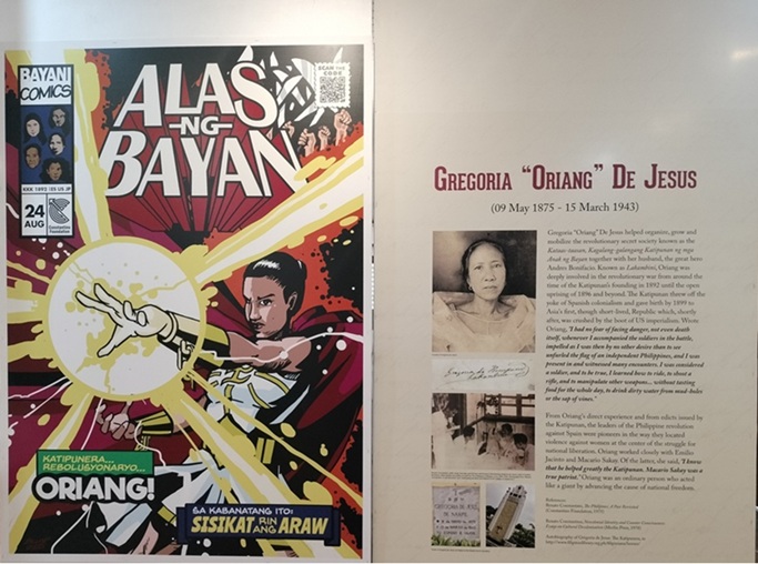 The panel quotes words from Oriang’s memoir: “I had no fear of facing danger, not even death itself, whenever I accompanied the soldiers in the battle, impelled as I was then by no other desire than to see unfurled the flag of an independent Philippines, and I was present in and witnessed many encounters. I was considered a soldier, and to be true, I learned how to ride, to shoot a rifle, and to manipulate other weapons… without tasting food for the whole day, to drink dirty water from mud-holes or the sap of vines.”