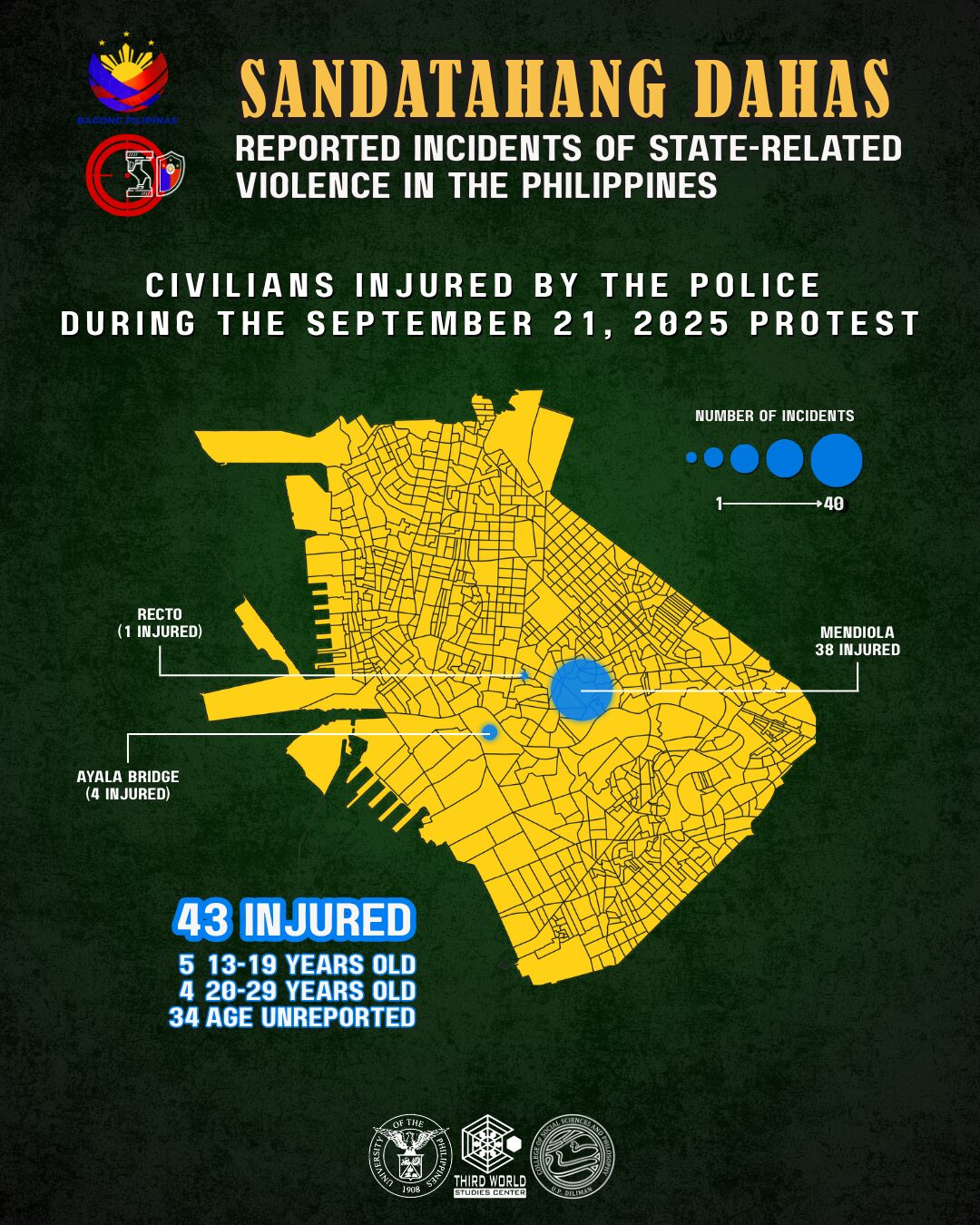 No single event in 2025 produced as many incidents of state-related violence as the September 21 protest. The Sandatahang Dahas monitor of the UP Third World Studies Center recorded a total of 390 killings and 520 injuries resulting from incidents of state-related violence throughout 2025. Of these, 194 injuries erupted from that protest alone, with 151 of these being police officers, and 43 being civilians.
