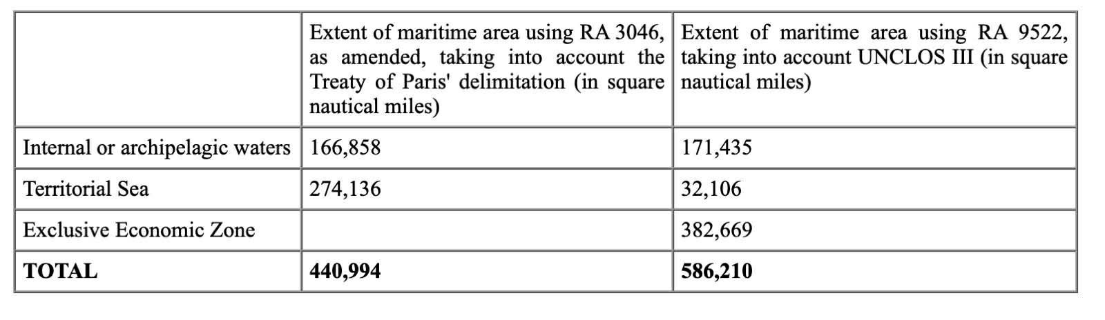 His ponencia presented a table comparing the extent of territorial sea (TS) and exclusive economic zone (EEZ) under the old baselines law (RA 3046, 1961) and the new baselines law (RA 9522, 2009). In that table he acknowledged that the TS under RA 3046 stretched up to the limit set by the 1898 Treaty of Paris and therefore spanned 274, 36 square nautical miles (SNM). Under RA 9522 and UNCLOS, the TS will stretch only up to 12 NM and therefore contract to 32,106 SNM. He wrote: