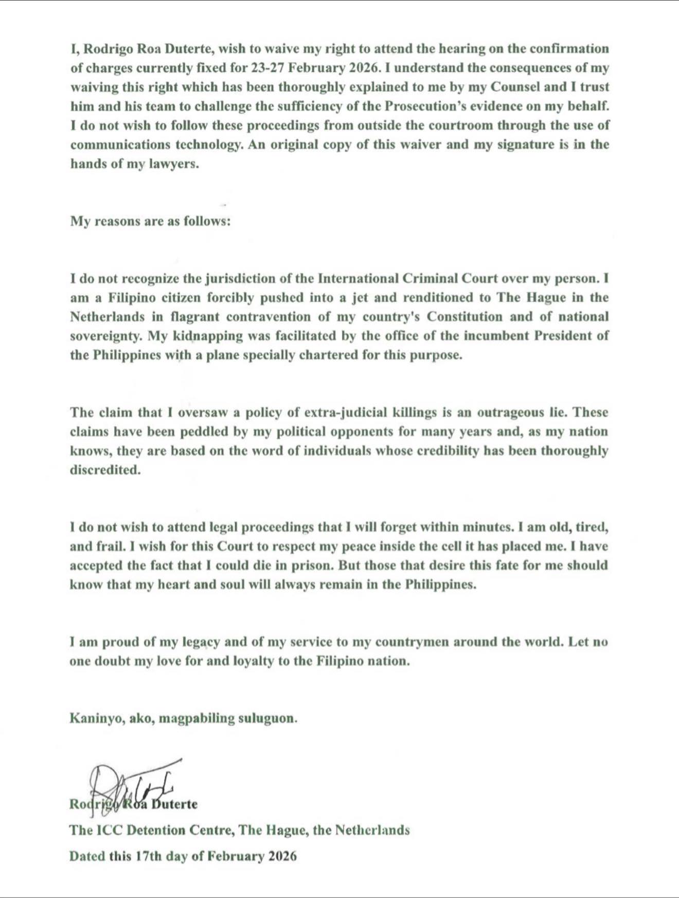 In a signed waiver dated Feb. 17 and first posted on the vlog “Alvin and Tourism” before spreading on social and mainstream media, Duterte wrote: “I wish to waive my right to attend the hearing on the confirmation of charges currently fixed for 23-27 February 2026,” including through the use of communications technology.