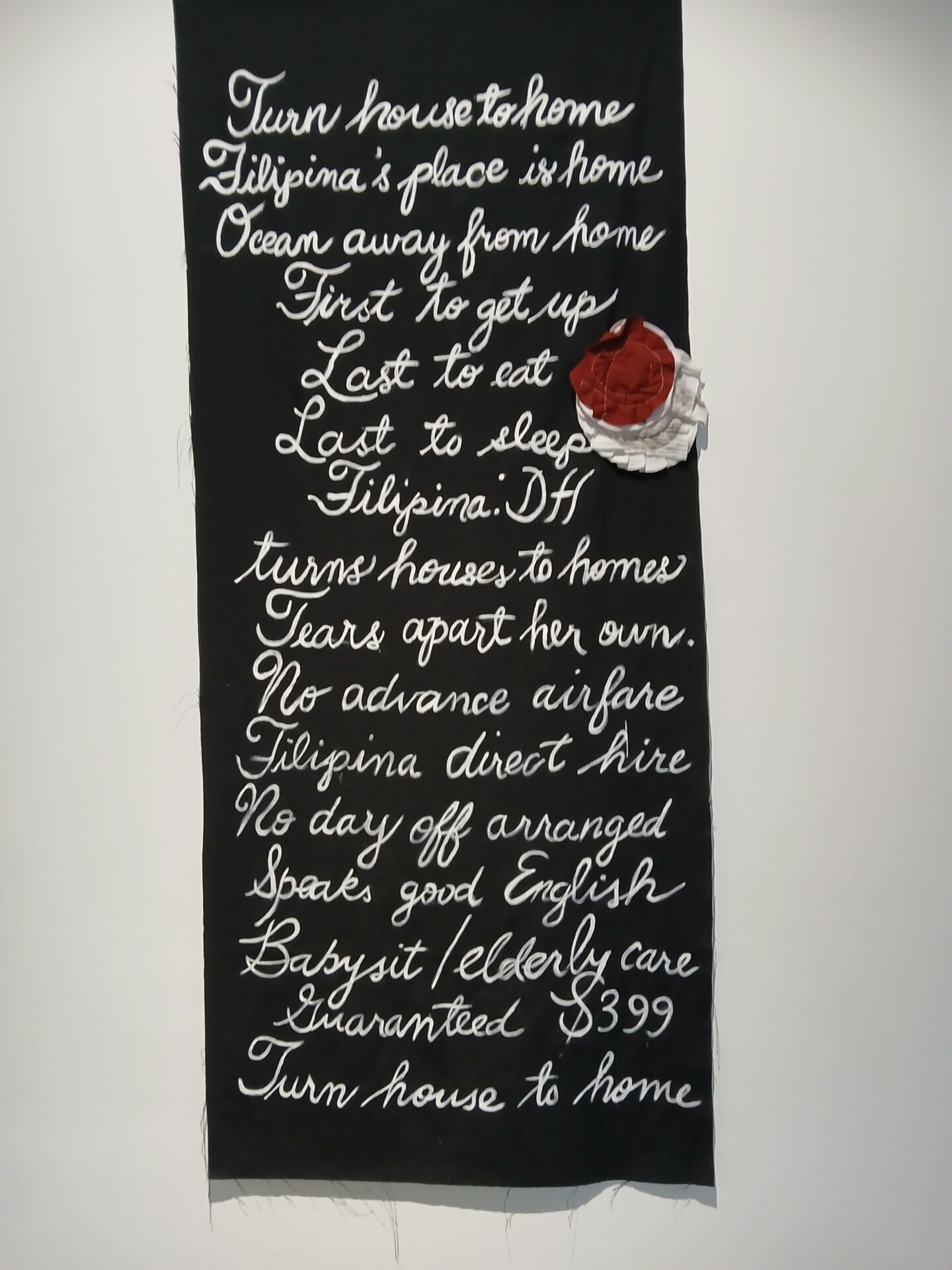 Endaya’s installation Filipina DH is composed of several pieces: A black blouse with the word “Dignidad” and a black apron with a pocket full of wooden clothes pegs. Cleaning tools taped and wrapped in black plastic: a mop, a broom, a dustpan, an ironing board emblazoned with the golden rays of the Sorrowful Mother. A wall of black cloth with Tagalog text lists a litany of issues: widespread poverty, high prices, government corruption, no jobs in one’s own country, migrants who sell their land, jewelry, and carabao as placement fee, and the proliferation of job scams. In short, how to become a slave abroad.