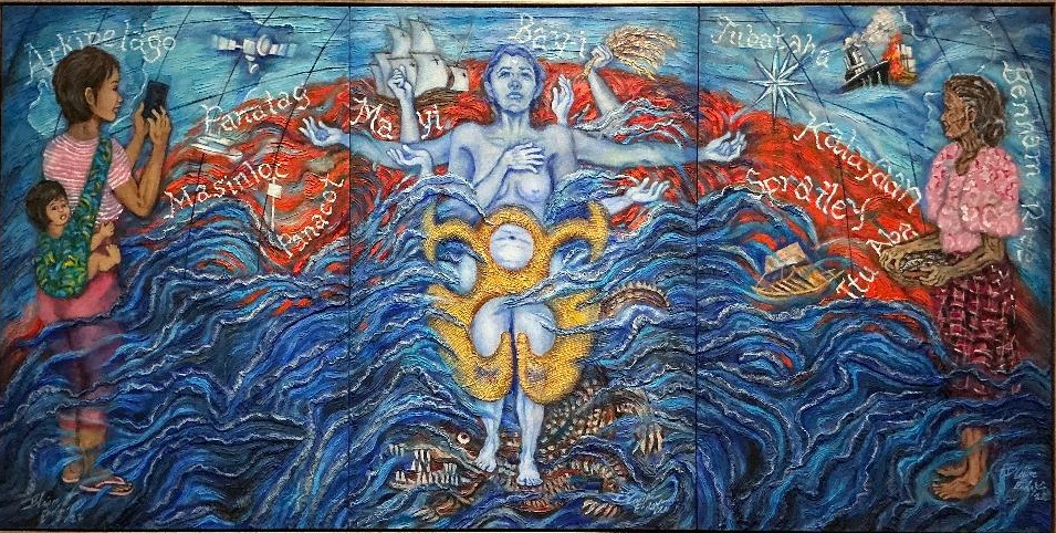 A triptych, Bay-I sa Ika -5-Dantaon (2021-2022) depicts the past, the present, and the future collide amidst a lone indigenous woman with many arms, naked and standing tall, and covered by a golden lingling-o, a symbol of fertility and prosperity, amidst a raging sea. Her feet crushes some sea monsters below.