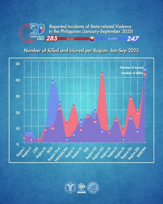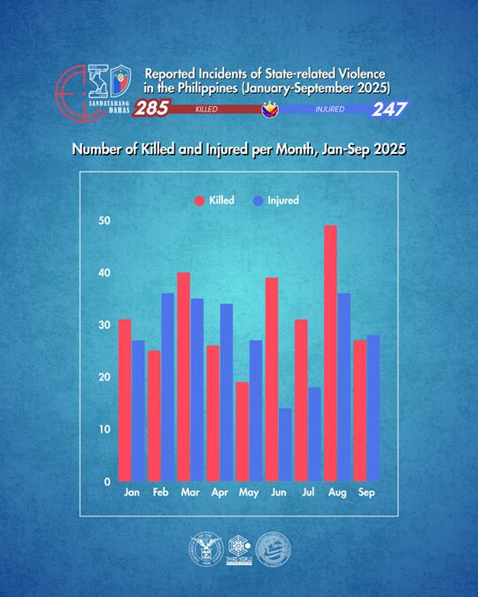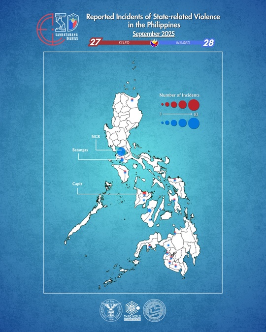 The Sandatahang Dahas monitor of the UP Third World Studies Center recorded 27 killings and 28 injuries in state-related incidents this September, bringing the total number of those killed this year to 285 and those injured to 247; a rate of almost one each, each day.