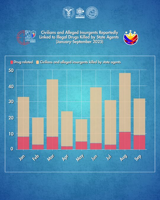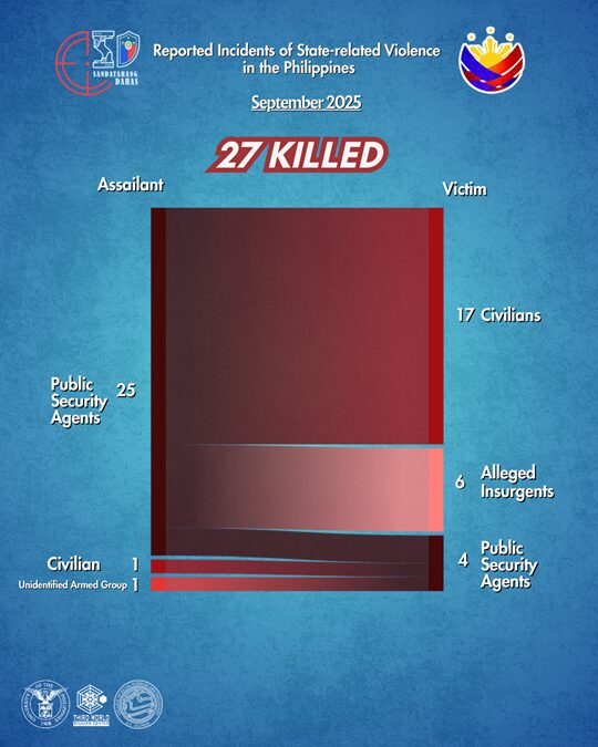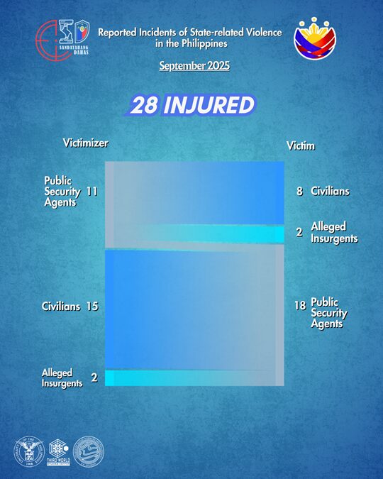 [Note: The Sandatahang Dahas count for September 2025 does not yet include the injuries and at least one possible death caused by state actors during the Sept. 21 anticorruption protests. Media reports, drawing solely from figures released by the Philippine National Police (PNP) a day after the protests, state that 129 police officers and 76 civilians were injured due to the violent confrontations between the police and the protesters that flared up early afternoon at the south-end of Ayala Bridge along Romualdez Street then at the Mendiola-Legarda-Recto area until late in the evening. These numbers, however, cannot be relied on to answer the question of who injured whom. Were the civilians solely injured by the police or were they injured by the protestors? Four days after the police released its figures, human rights lawyers from the National Union of Peoples’ Lawyers, Karapatan, and the Public Interest Law Center said that the PNP made 216 arrests, almost half of whom were minors. A number of these arrests, as seen on news video clips and in social media posts by various individuals at the scene, involved physical assaults by the arresting officers and there were also instances of civilians ganging up on the police while an arrest was being made. Were these documented cases of assaults already accounted for in the figures released by the PNP? Sandatahang Dahas’s method of recording instances of state-related violence relies on news reports and official data that clearly establish who the assailant was and who was the victim. The current pieces of information remain unclear and imprecise for the Sandatahang Dahas’s count. Research is being conducted to arrive at a clearer context and a definite number, the result of which will be made available in succeeding Sandatahang Dahas reports.]
