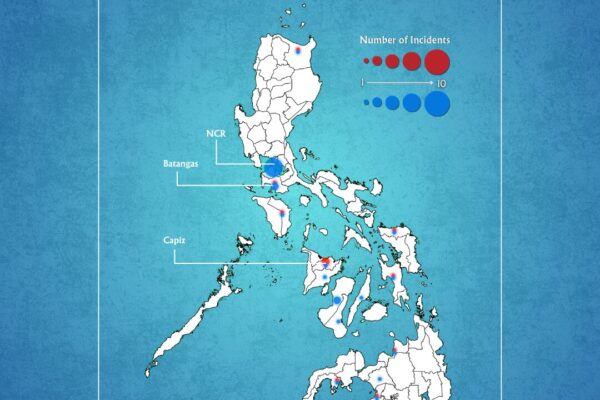 For September, Visayas bears the brunt of the highest number of casualties (19 cases), with 10 killed and nine injured. Most of the cases are concentrated within Capiz, especially within the anti-insurgent operations in Tapaz. Luzon ranks second, with three killed and 14 injured, particularly concentrated within the areas of the National Capital Region (NCR) and Batangas. Mindanao, last month’s island group with the highest number of incidents, ranks third with 16 incidents. Incidents are fairly scattered across the region, with Zamboanga del Sur and Misamis Oriental having the most number of incidents with three cases each.