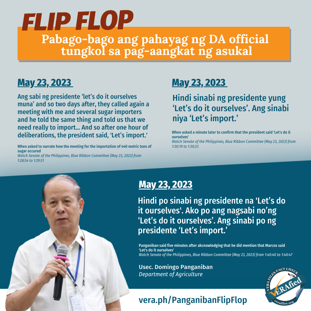 Sa isang pampublikong pagdinig ng Senate Blue Ribbon Committee noong Mayo 23, anim na beses na nagbago si Agriculture Undersecretary Domingo Panganiban sa mga pahayag hinggil sa direktiba ni Pangulong Ferdinand “Bongbong” Marcos Jr. sa unang bahagi ng taong ito na mag-angkat ng asukal.