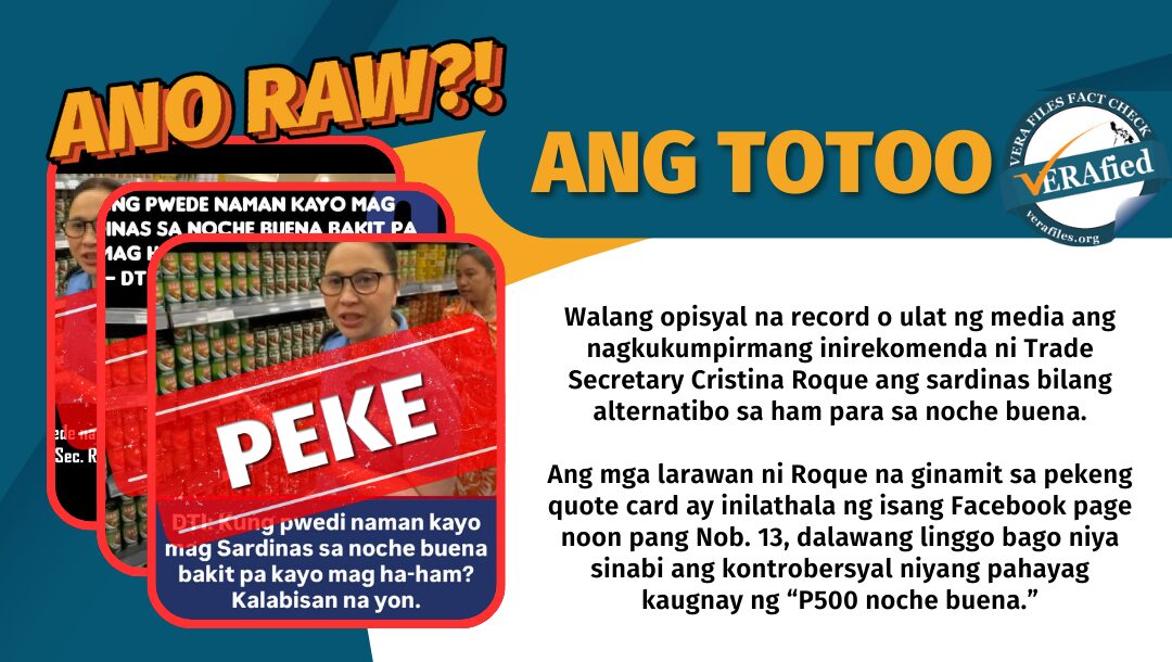 May pinakakalat na quote card na sinabi raw ng DTI secretary Cristina Roque na puwede namang magsardinas kaysa mag-ham sa noche buena. Peke ito.