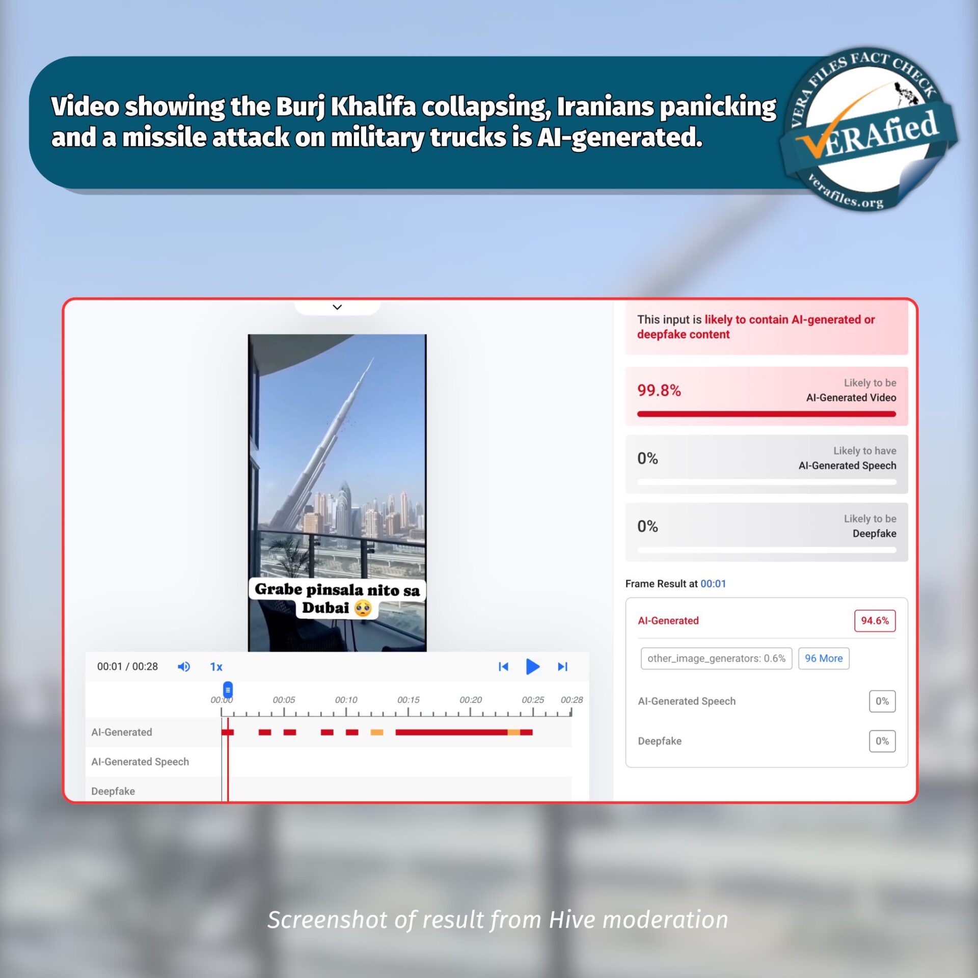 Results from the Hive Moderation AI detector flagged the circulating video as 99.8% likely to be AI-generated.