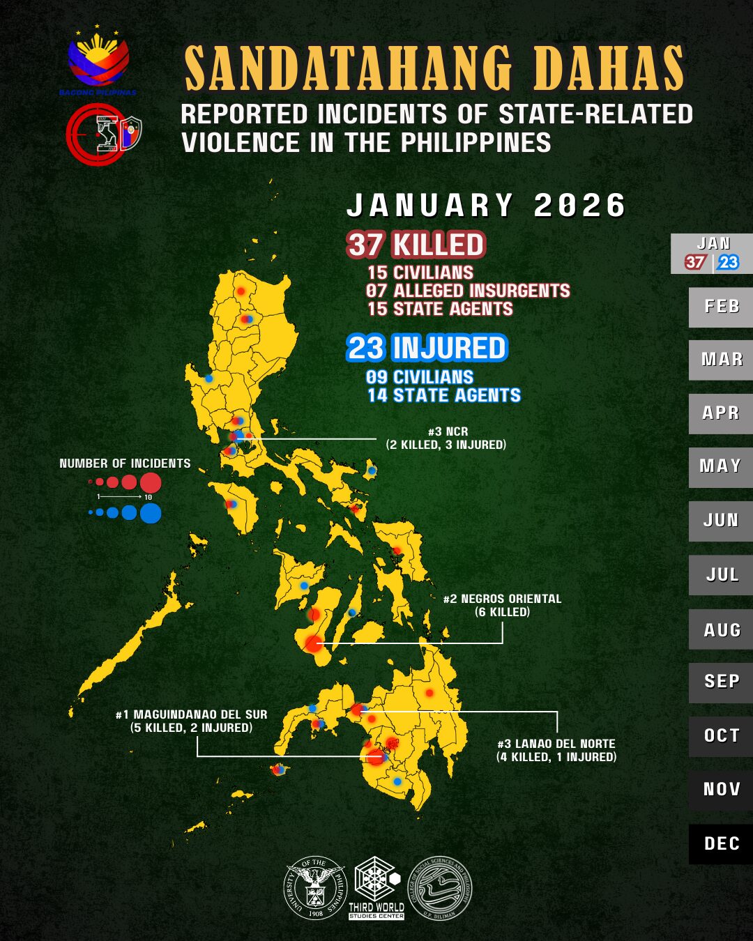 The year 2026 dawned with Mindanao having the most number of incidents of state-related violence, with 18 killed and eight injured. Maguindanao del Sur, a persistent hotspot in Sandatahang Dahas monitoring, again incurred the most incidents in January, with five killed and two injured. Lanao del Norte followed with four killed and one injured, with all incidents inflicted by Dawlah Islamiyah against soldiers. Cotabato had four killed, while Zamboanga del Sur followed with three incidents (one killed and two injured). Basilan had one killed and one injured. Meanwhile, Agusan del Sur, Lanao del Sur, and Maguindanao del Norte each had one killed, while South Cotabato and Zamboanga del Norte reported one injured each.