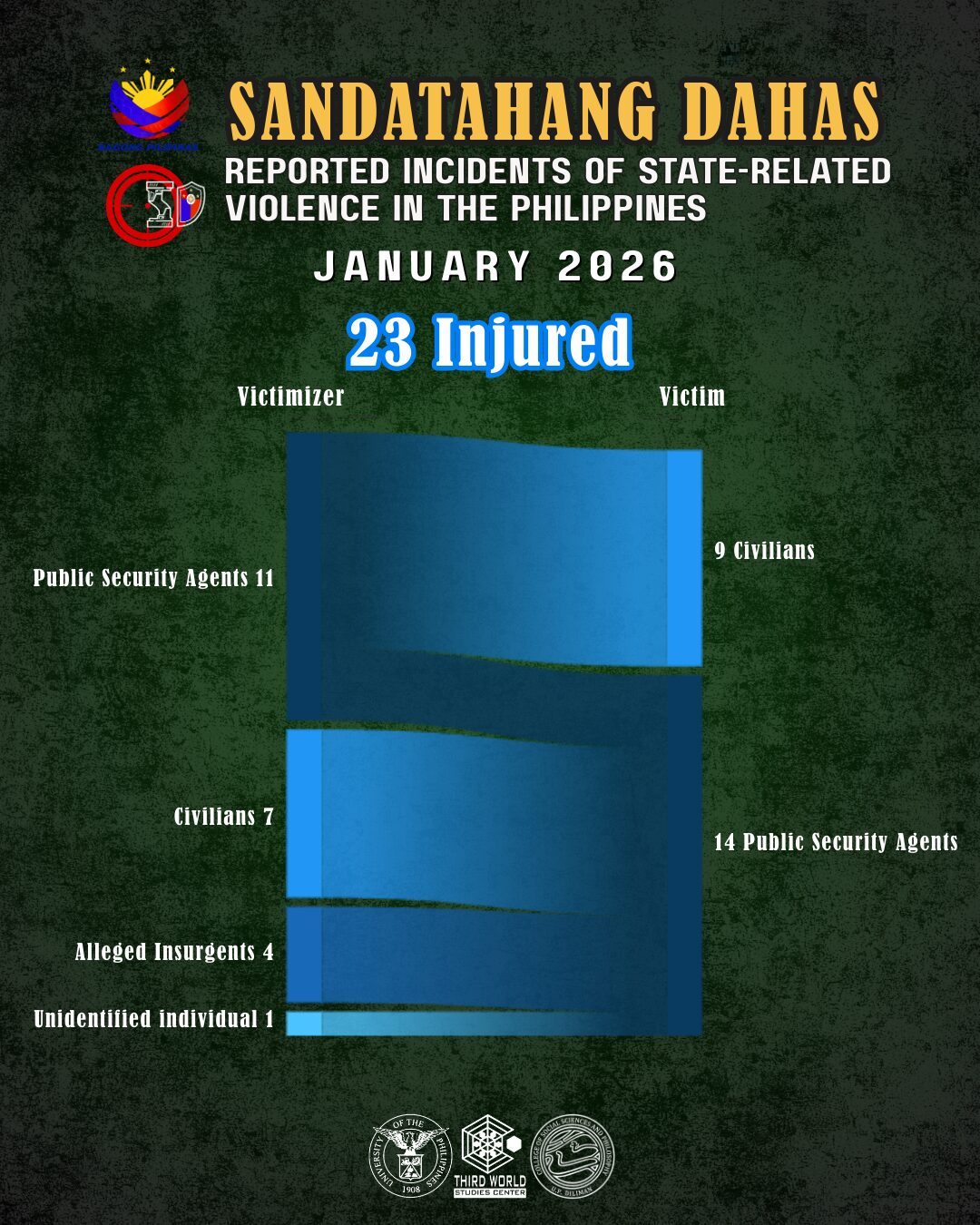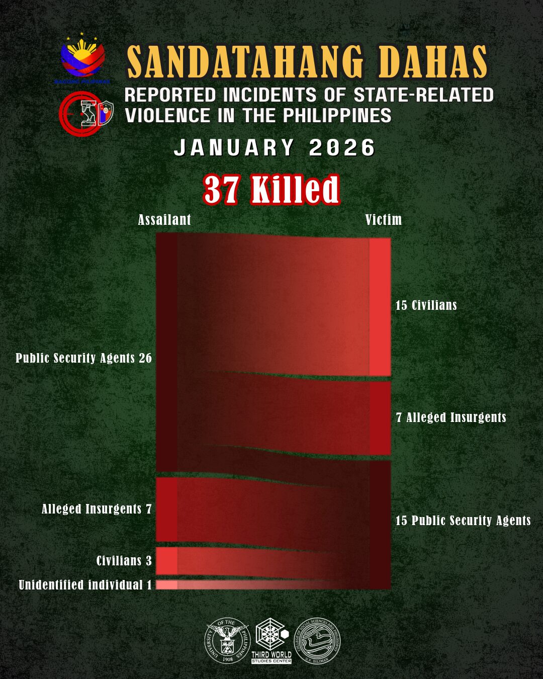 Aside from the three mentioned, 11 more state agents were killed in January 2026. At 14, this is the highest number of state agents killed recorded by Sandatahang Dahas monthly monitoring so far. Of these, half were killed by members of Dawlah Islamiyah.