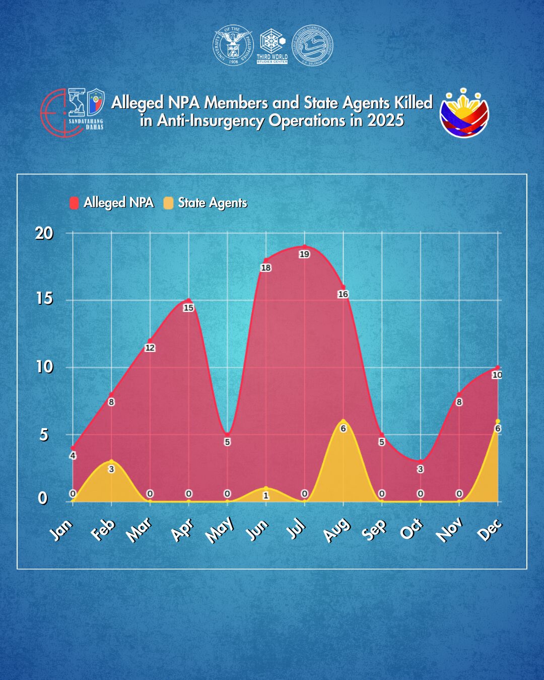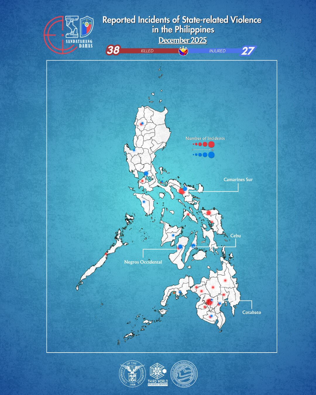 State-related violence remains widespread in the last month of 2025. Certain regions, such as Eastern Visayas and the Bangsamoro Autonomous Region of Muslim Mindanao, have become consistent hotspots of state-related violence. While Sandatahang Dahas began releasing monthly reports for the first time this year, the Third World Studies Center began tracking state-related violence in 2023. This was in collaboration with the University of Exeter through an earlier project called the Lethal Force Monitor. In its first year of monthly monitoring, Sandatahang Dahas has recorded significant trends: violence from anti-insurgency operations, violence in civil demonstrations, and sexual and domestic violence committed by state agents, among others. In our forthcoming yearly report, these overall trends will be discussed in more detail. In the meantime, Sandatahang Dahas will continue its monthly monitoring in 2026.
