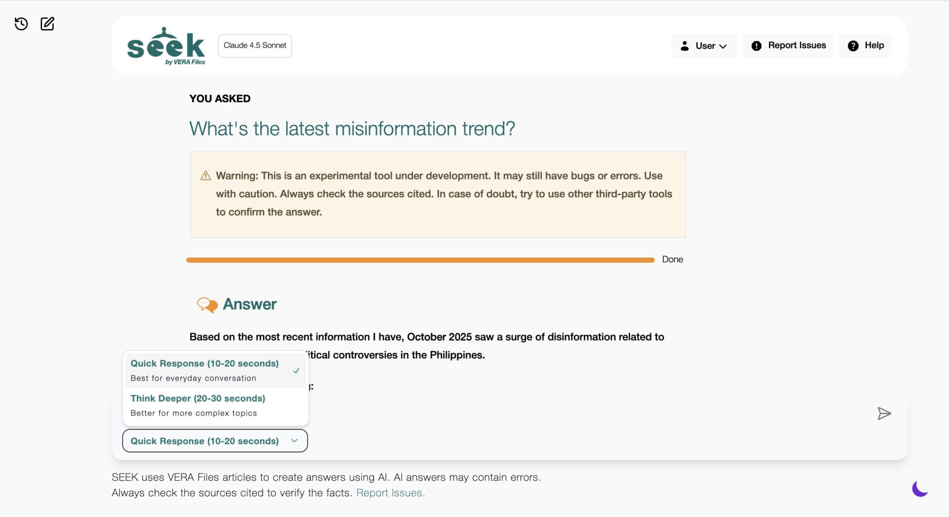 SEEK uses VERA Files’ database of articles as its knowledge base, and it uses a large language model (i.e. Claude 4.5 Sonnet) to craft an answer.