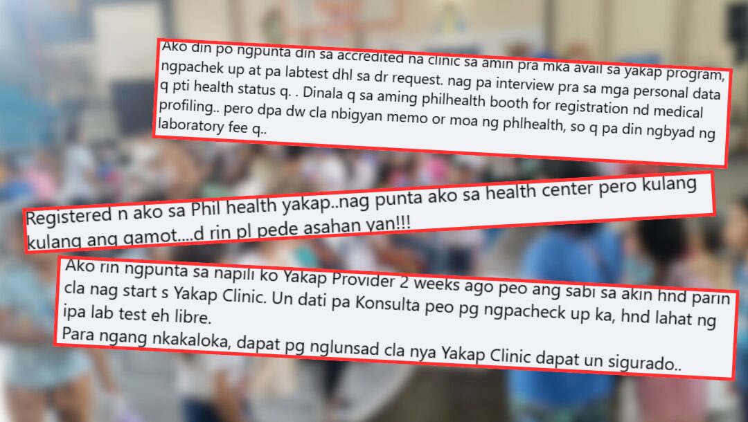 Several members who registered with YAKAP centers and were expecting to be served after continuous publicity by the state insurer had common complaints: 1) the health center, clinic or hospital is unaware of being included as a YAKAP provider; 2) there is a lack of doctors for consultations, or they fail to show up to see patients scheduled for the day 3) there is limited time to see patients; and 4) PhilHealth has yet to give guidelines for the program implementation.