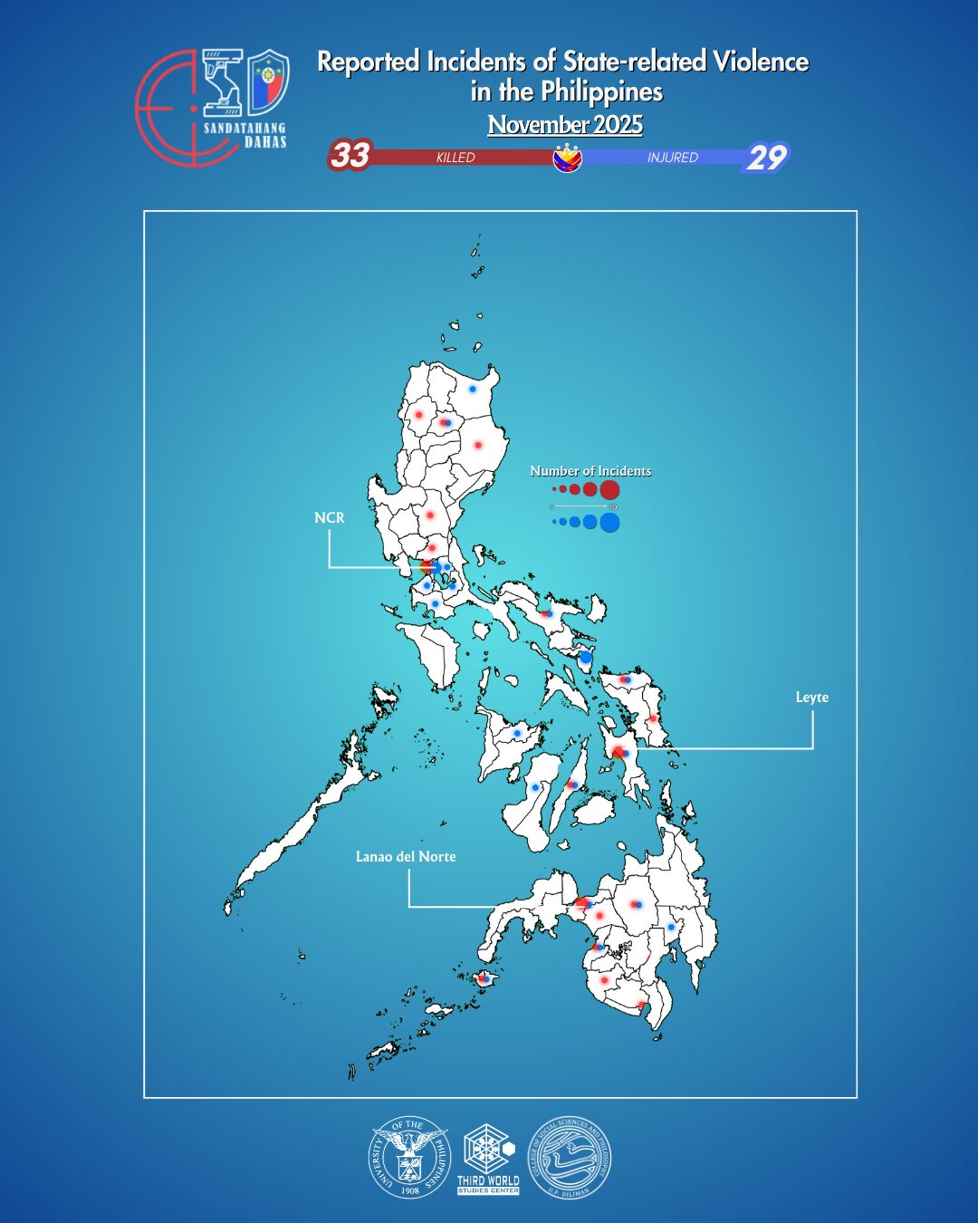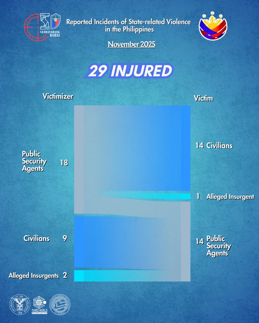 In Nov. 2025, Sandatahang Dahas recorded 33 individuals killed and 29 injured in incidents of state-related violence. This month stands out for having a higher number of incidents of violence between members of state forces. Similar to what was previously recorded by Sandatahang Dahas, the trend of sexual violence committed by state agents, notably members of the Philippine National Police (PNP) continues this November. There were also a number of police brutality cases.