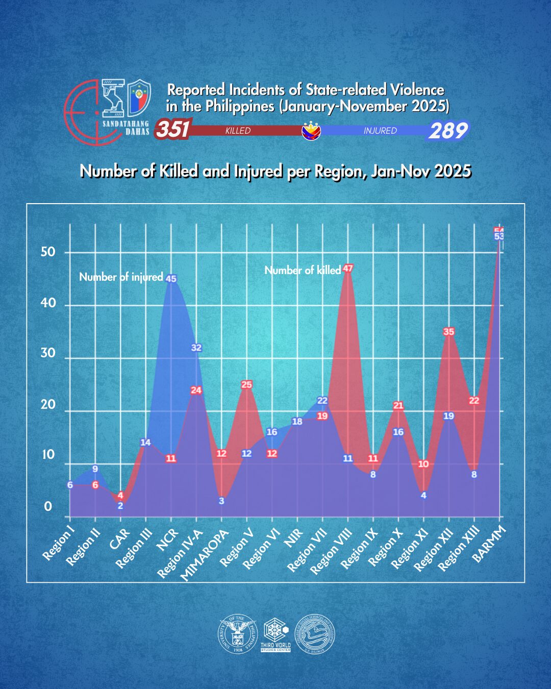 November recorded the widest spread of state-related violence in 2025 so far, with 31 provinces reporting such cases. Four provinces recorded their first cases of state-related violence for the year: Abra (two killed), Kalinga (one killed and two injured), Sarangani (one killed), and Sorsogon (two injured).