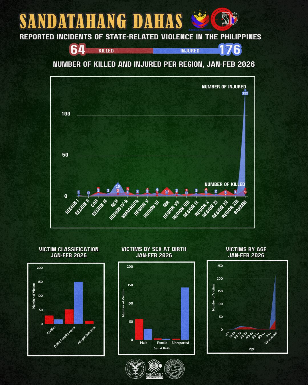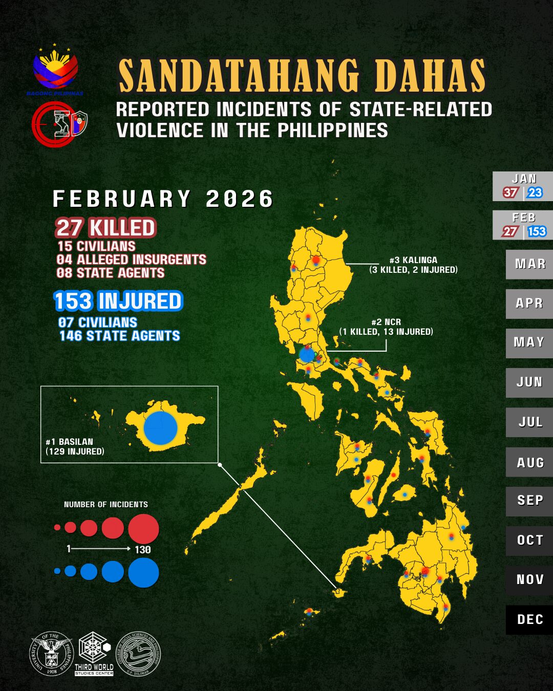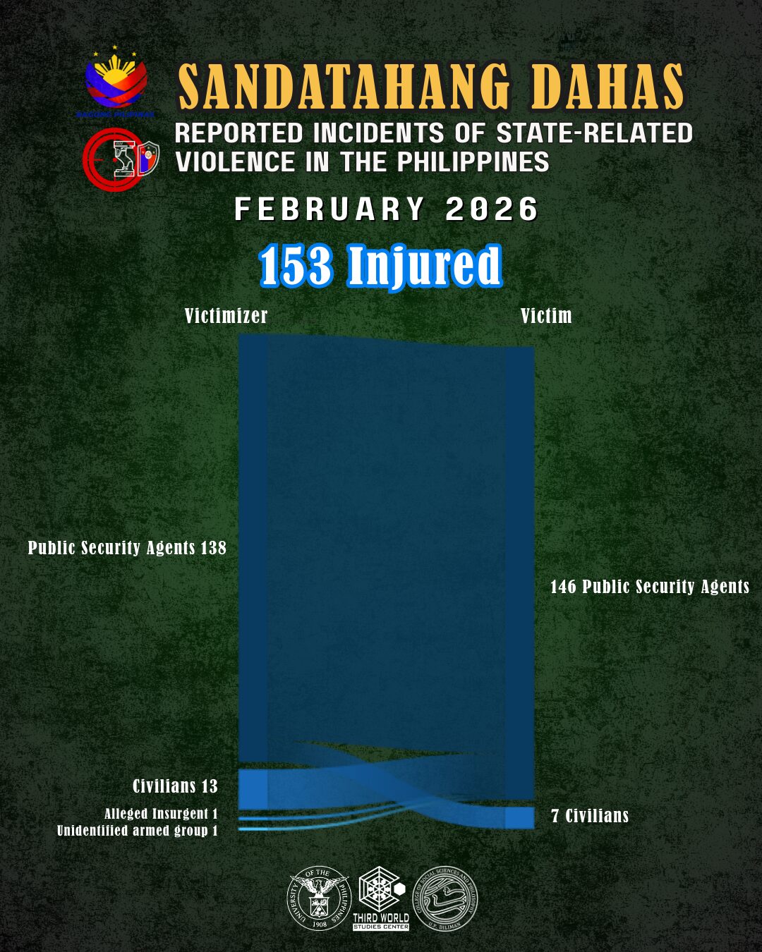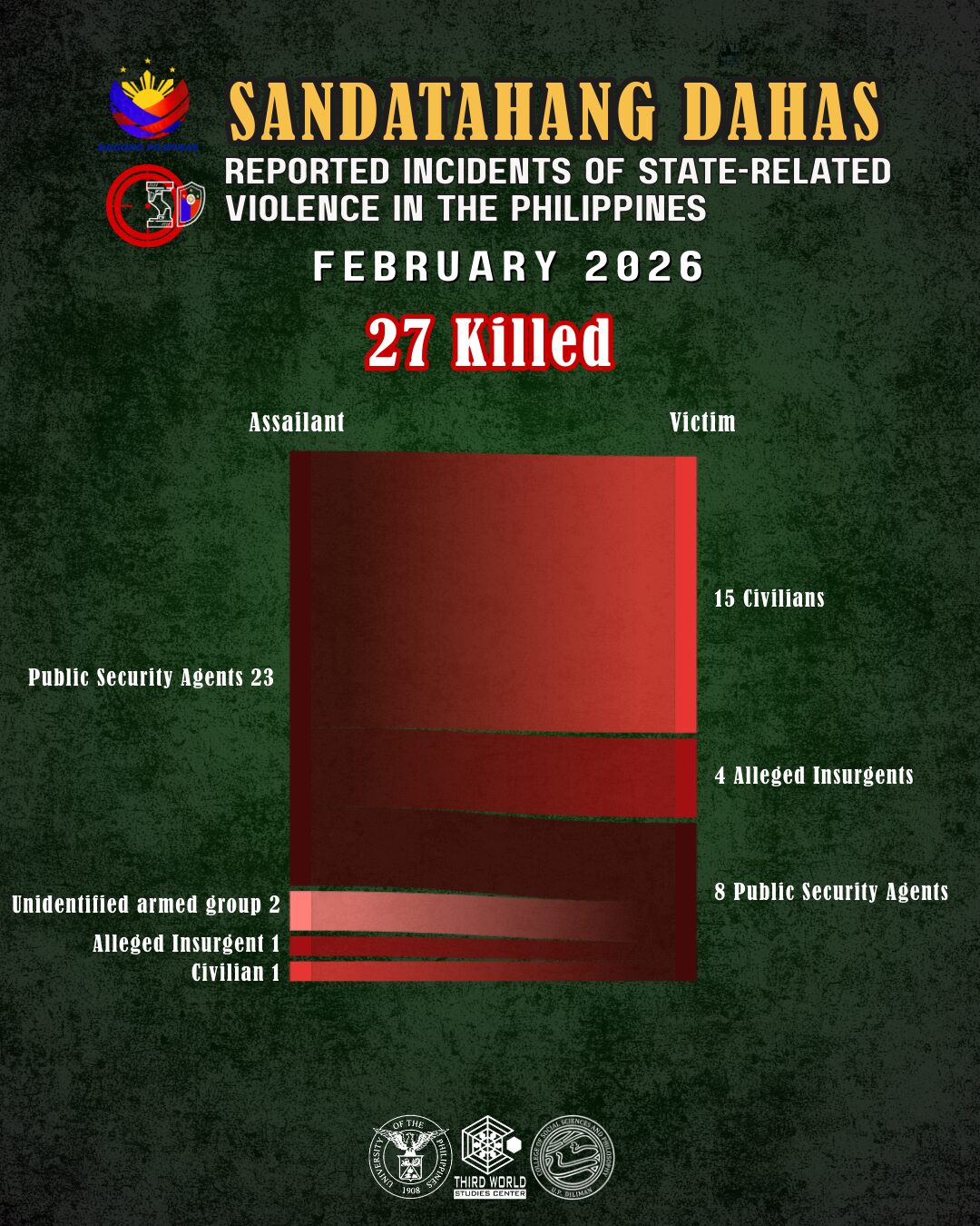 Of the 27 killed in state-related violence that Sandatahang Dahas recorded in February 2026, four were cases of members of the armed forces turning on each other. This equals that of January 2026 when a drunk policeman, after he was arrested for killing a civilian in a bar, killed his own chief and two other officers in Sibulan, Negros Oriental. The fourth fatality in that month was an assistant detachment commander of Philippine Army in Rodriguez, Rizal shot by members of the Citizen Armed Force Geographical Unit Active Auxiliary under his command. The army officer had earlier reprimanded the CAFGU members for drinking inside the camp.