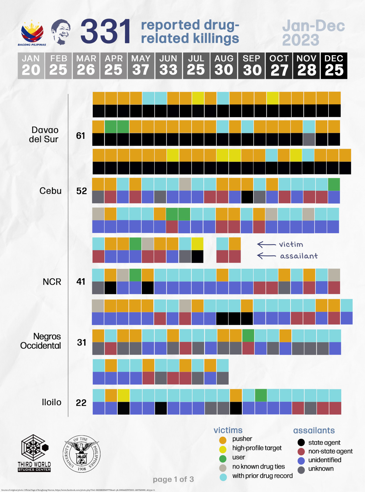 State agents killed 137 or 41.39 percent of the 331 reported drug-related killings, unidentified assailants account for 108 (32.63 percent), non-state agents (they were identified by witnesses) caused 53 deaths (16.01 percent), and unknown assailants (no identification whatsoever, known only by their works, which are mostly body dumps) were responsible for 33 killings or 9.97 percent of all the deaths last year.