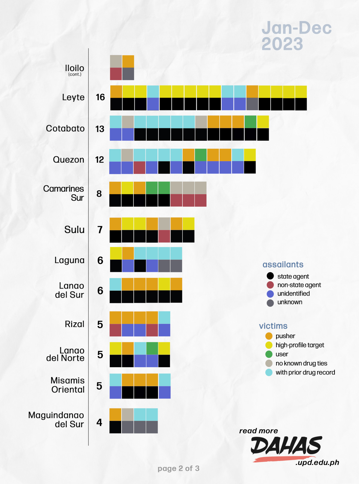 Our monitoring in Dahas, covering the entire year of 2023, yields a much higher number of casualties: 331. This is 7 more deaths than our total for 2022, which is 324—149 in Duterte’s last 6 months, and 175 in Marcos Jr.’s first.