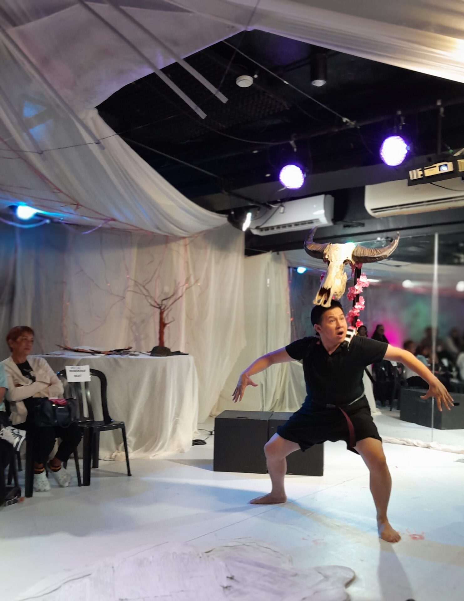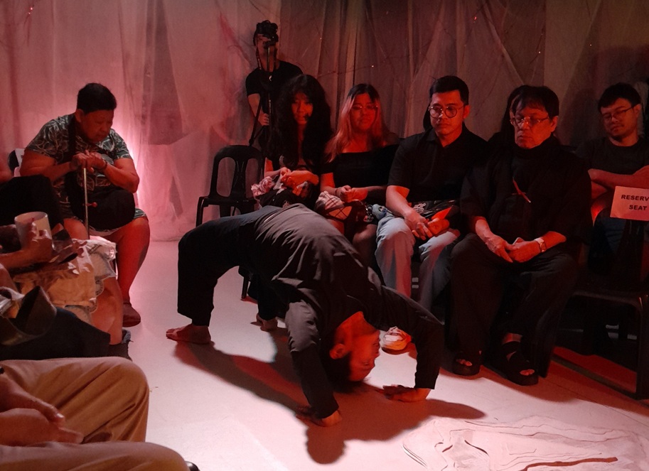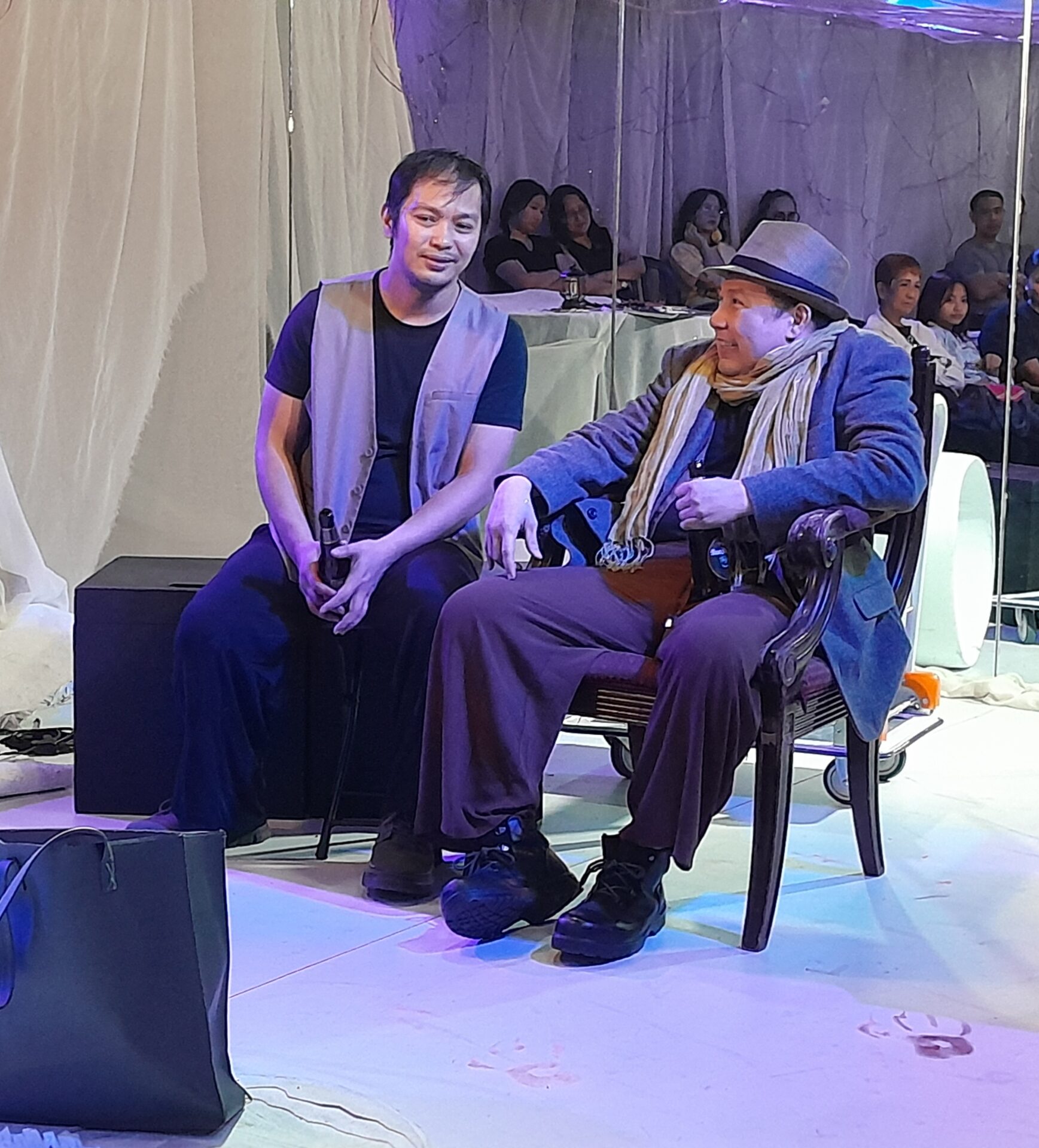 And indeed the two male protagonists roll on the floor, climb blocks and orate, dance, move and run the course of human emotions from anger to sadness to grief to peace and happiness. The space of the makeshift Mirror Studio Theater is limited, but trust Anton Juan not to be constricted by this. He covers the mirrors with white gauze or muslin curtains on which various images are projected from the night galaxy to a distorted mien of former President Rodrigo Duterte with his disembodied voice uttering coarse words.