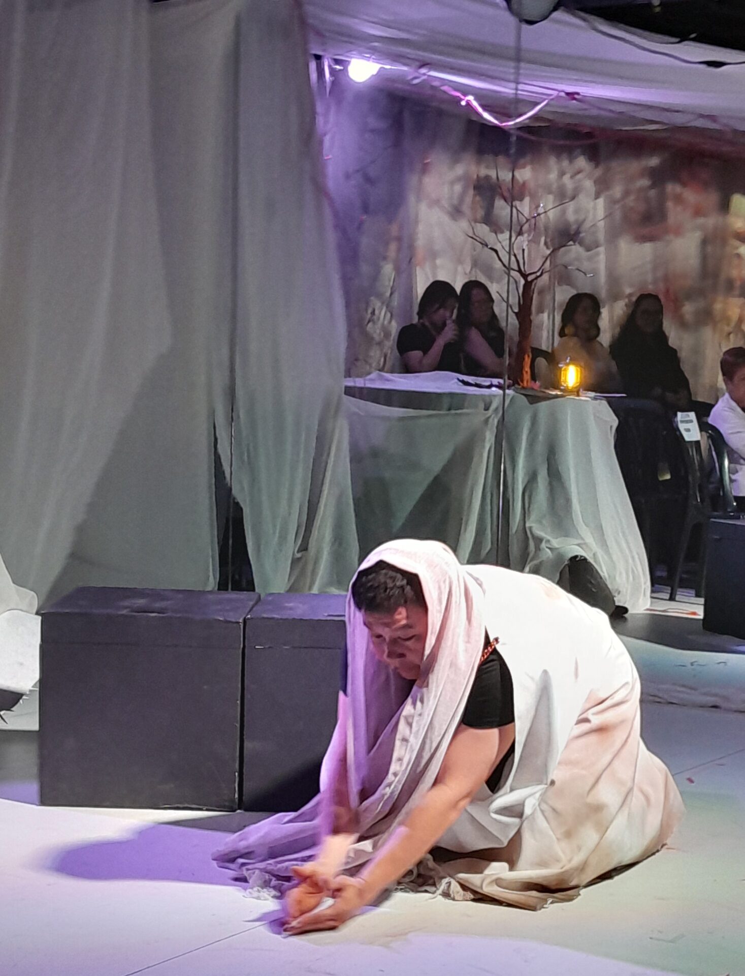 Gut-wrenching is the backhanded compliment to Sophocles’ tragedy Antigone with Maestro’s tour de force performance of the title role. Antigone is depicted as maddened by grief for her slain brother Polynices. She insists on a proper burial for him before the usurper to the throne, her uncle Creon (haughtily played by the Actor). By this time, the Actor has acquired more confidence and is indeed kingly, if not dictatorial, in his behavior.