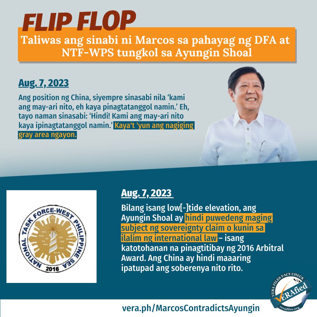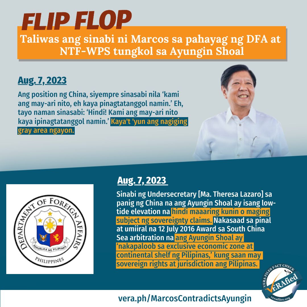 Sa pagsasabing ang magkasalungat na maritime claim ng Pilipinas at China sa Ayungin Shoal ay isang “gray area,” kinontra ni Pangulong Ferdinand Marcos Jr. ang mga pahayag ng Department of Foreign Affairs (DFA) at ng National Task Force for the West Philippine Sea ( NTF-WPS) na ang desisyon ng arbitral court noong 2016 ay nagdeklara sa lugar bilang hindi maikakailang bahagi ng Philippine exclusive economic zone at continental shelf.