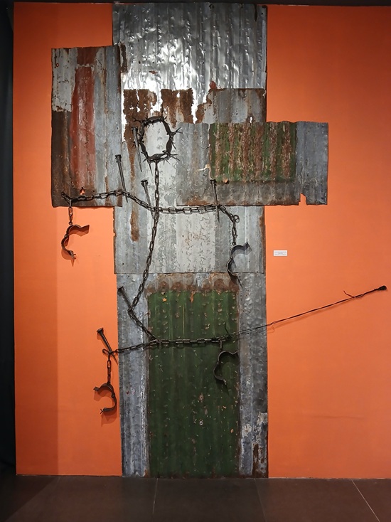 Primed, 2025, a sculptural work by Alfredo (b.1962 ) and Isabel (b. 1965) Aquilizan, is made of forged metal on rusty corrugated iron, with barb wires for a head, metal chains for the body, dangling open shackles, and hand-forged nails. It speaks of sacrifices and sufferings of a people crucified daily by plunder and corruption.