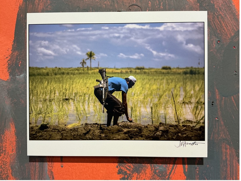 Jes Aznar sets a tone of defiance and persistence in his Untitled, 2025, a dye sublimation print on aluminum of a man planting rice with a semiautomatic rifle slung around his shoulder. Vigilance is key, in planting rice or in war. His other work in the exhibit, Against the Dying of the Light speaks of protests, demonstrations, and police brutality, a familiar scene in the streets of Manila, an image captured in 2018 and printed in 2025.